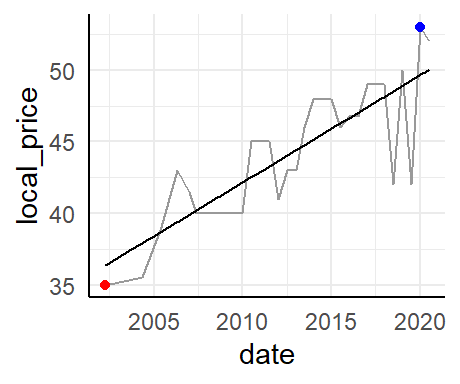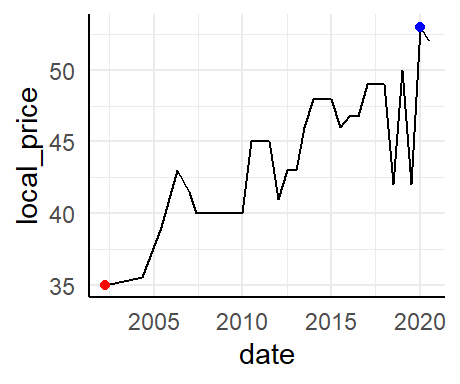 geom_point(data = . %>% filter(local_price == max(local_price)), color = "blue") +