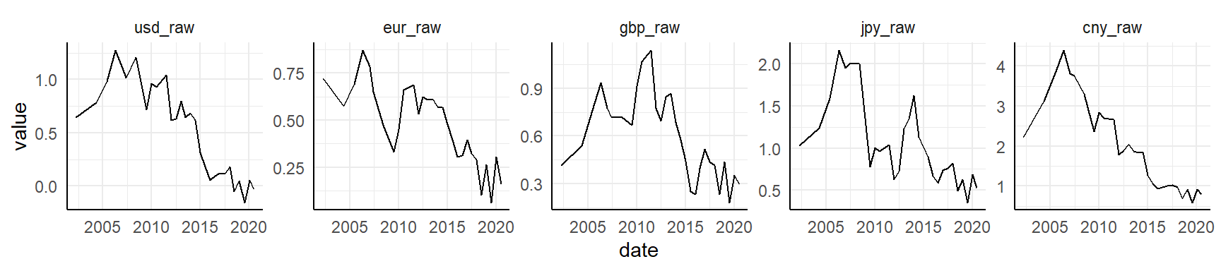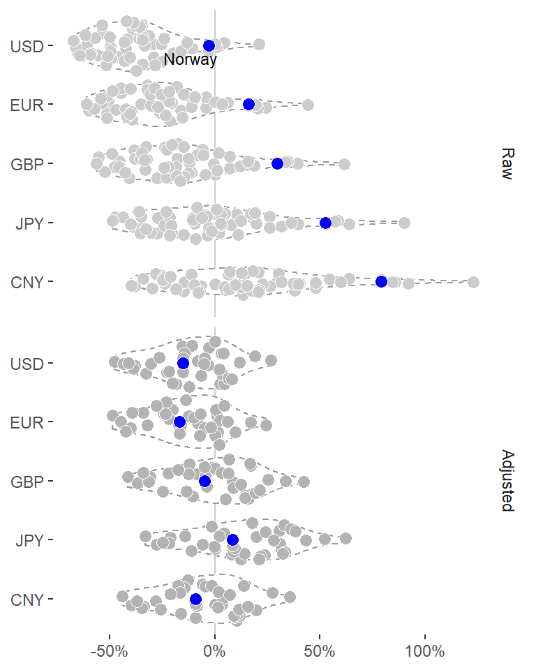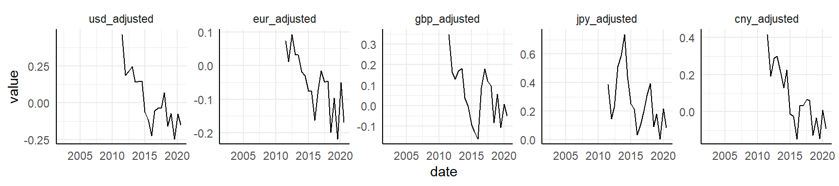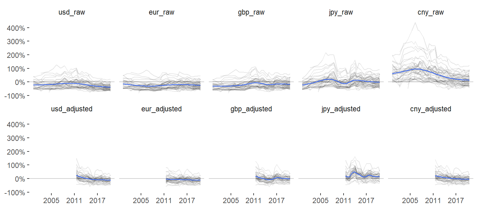 This is a nice illustration! A bit busy right here, of course, but each panel would suite a cell in an HTML table very nicely. Also, ideally we would like to effectively visualize these graphs for all raw and adjusted comparisons (all countries versus USD, EURO, BGP, JPY and CNY), but this way would be slightly complex here.