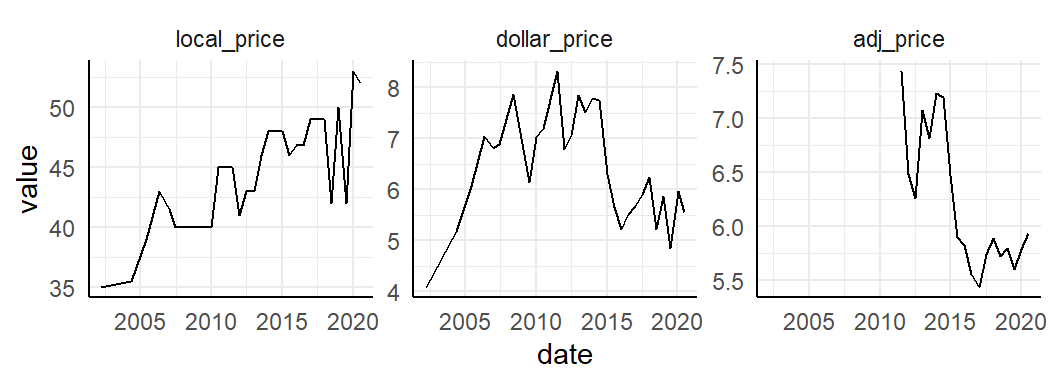 Let’s plot Norway over time. First look at local_price, dollar_price and adj_price.